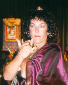 In 1984 Lama Tenzin had asked me to work on some of the traditional texts, to reshape them so that they could be sung in English. My neighbor, Jeff Munoz, used to sing the mantra of Tara. So I took the text, re-wrote it using Jeff’s melody for parts of it and my own for the rest and began doing this practice in English. Having a very restless mind and finding it difficult to sit for any length of time I would walk the hills around my home chanting, and in this way quickly memorized the text. As part of the training in the Tara practice we visualize Tara in front of us. The Tara that I visualized started to dance. And I danced with her.