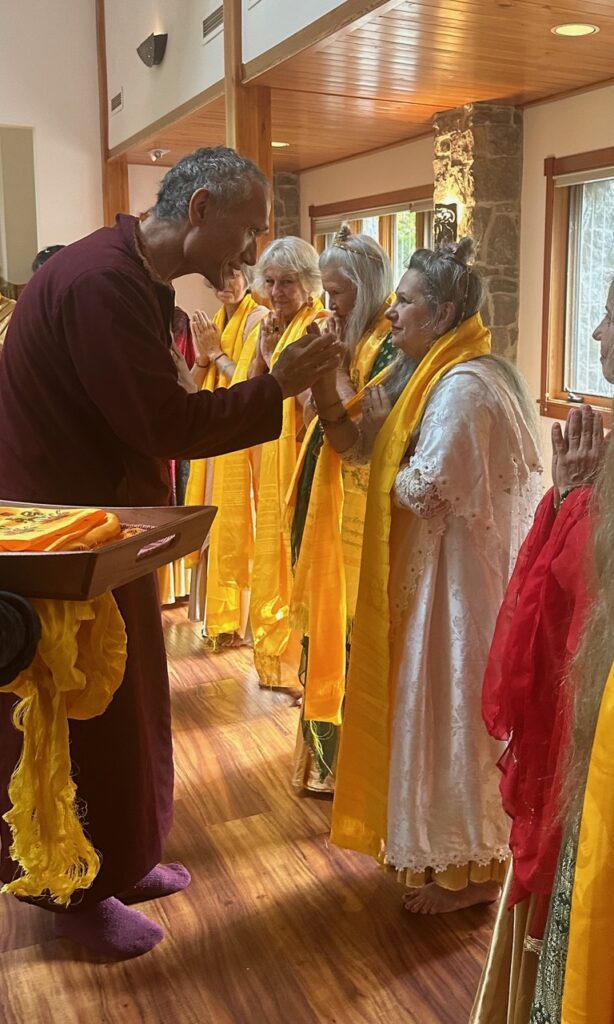 A special guest appearance was made by Venerable Yangsi Rinpoche, teacher of Helen. As the Tara dancers completed their formation in crescent mandala, Yangsi Rinpoche approached with staff-member Gabriel at his side carrying a wooden tray of golden katas. Yangsi Rinpoche blessed each dancer, placing a kata over her shoulders and then, with the dharani mudra ,“passed the light” to the dancer – touching his thumb and forefinger to hers. He shared words of inspiration revealing that in viewing the dance, as the mandala turned and one by one each Tara dancer appeared to dance her praise, his intention was to see every single dancer as a true emanation of Tara, proclaiming that the practice of this dance is certainly an accumulation of Wisdom.