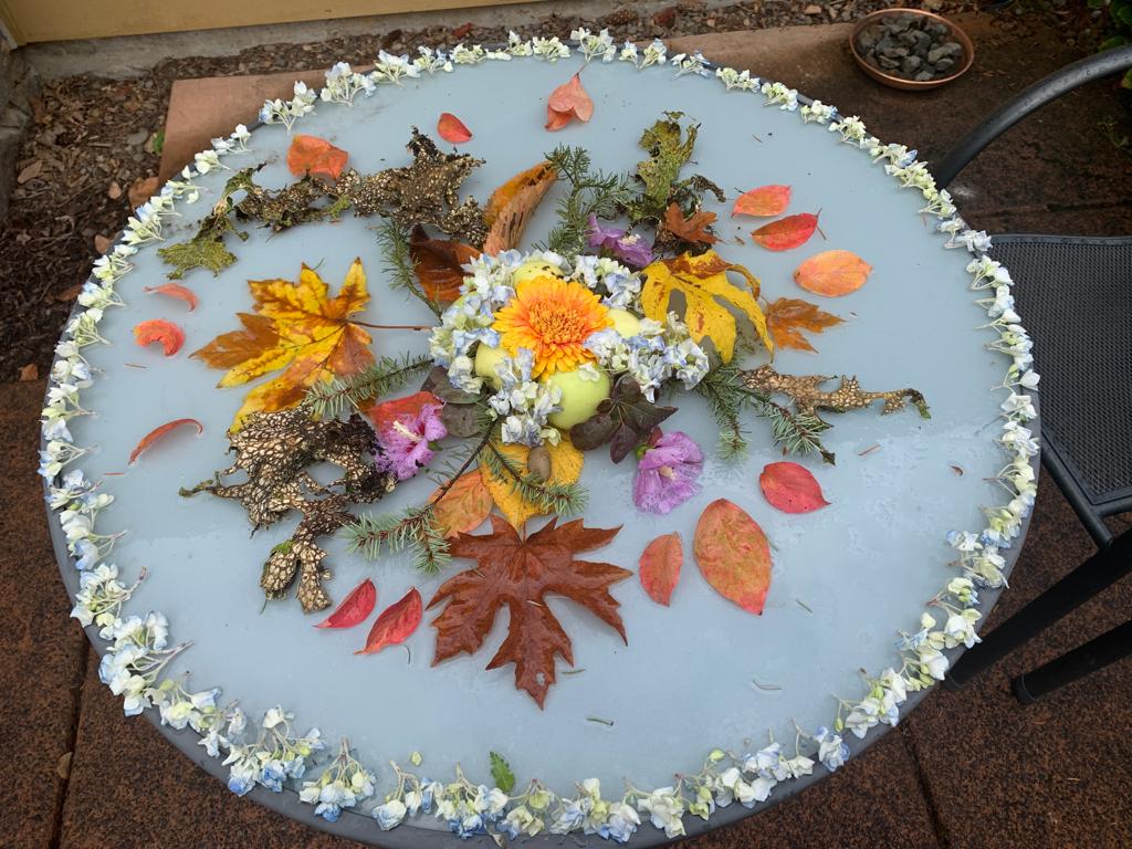 And after Myri’s class, the day was not yet over! Each afternoon, for four consecutive days we arranged a new mandala, and briefly walked through the sequence of steps in preparation for an evening offering of the Mandala Dance of Tara’s Twenty-One Praises. Every day a new central Tara giving instructions, a new set of positions in the mandala, a new Tara before you or behind you with whom you held hands. In order to ensure the health and well-being of each other, as much as was in our control to do so, we had all agreed to take extra precautions while traveling and tested every morning for 3-days to prevent spread of virus. And oh so delightful to be dancing together side-by-side, holding hands, in the flesh! We had a couple of dancers who were new to dancing the mandala and with so many experienced Taras present, the foundation of support was strong, yet flexible to accommodate all that arises.