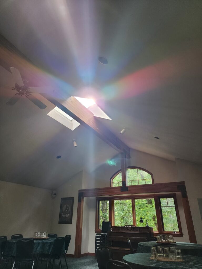 The dance of the Dakini is the interplay of the wisdom aspect of the elements that form all matter: earth, water, fire, wind, and space. Due to the arising of cold and damp weather, most of our gatherings took place In the spacious Great Hall of Forest Refuge. Though indoors, the design of the space boasting polished wood floors and many windows, allowed for us to remain in touch with the elements of our surroundings, letting in sunlight and crisp air, as well as views of foliage, rain, sky and fauna.