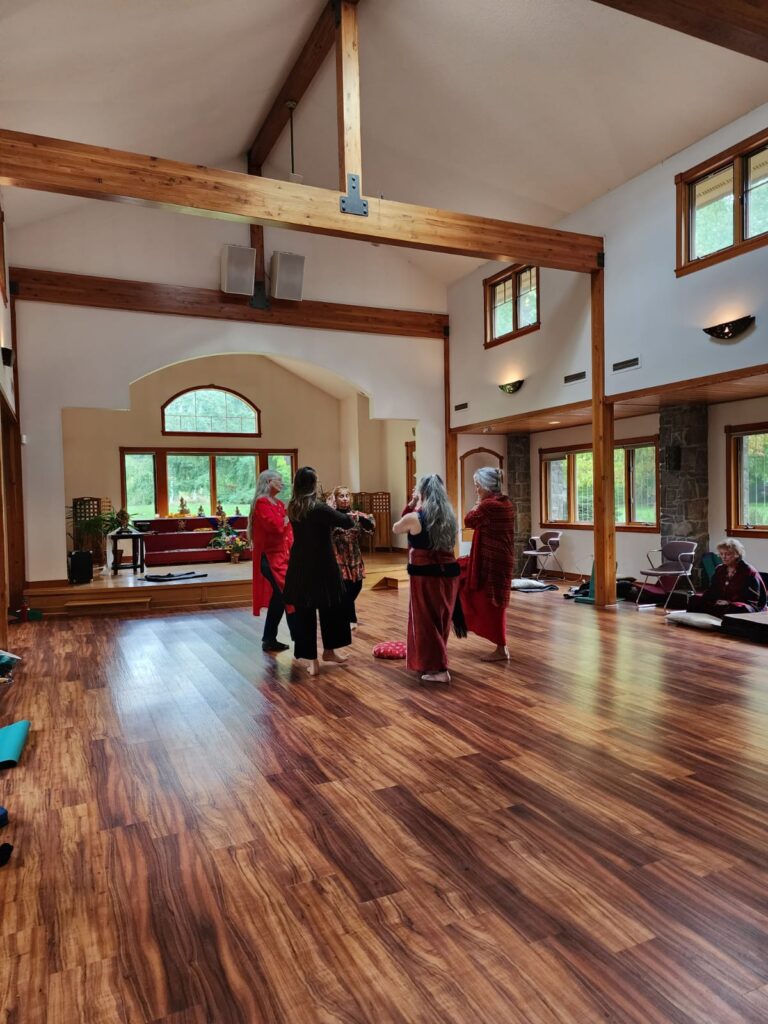 In September, 2023, nestled in the elemental beauty of Forest Refuge, twenty Taras gathered near Portland, Oregon at the second Sky Dancers Retreat. For many people the word ‘retreat’ brings to mind rest and relaxation, days spent in quiet stillness, meditation or contemplation. This experience, though heralded as a retreat, was more like a 5-day intensive training. The surroundings were beautiful, the accommodations restful, the staff amazingly nurturing and supportive. The work we engaged in involved long hours, deep contemplation, concentration on Sanskrit words, ancient mudras, and their meanings – all integrated into the body-mind through meditative dancing practice. Our intention was that of the Dakinis, “To bless and transform suffering into bliss.”