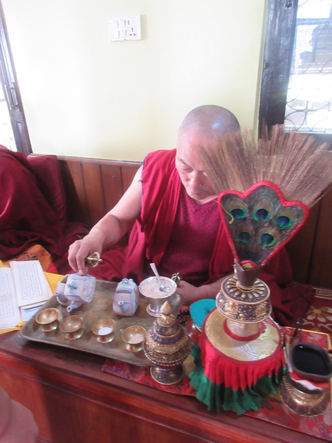 Ghen Jampa is offering the Golden drink, Serkym, this is made from milk, tea, alcohol and tsampa flour…special prayers are recited duringthis offering…then all are put together…one monk then uses a spoon and gives everyone a small amount to drink on our