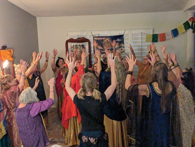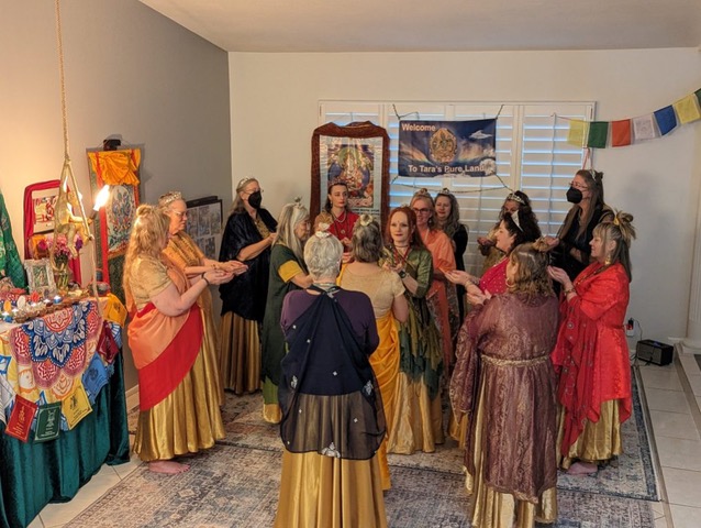 Parvati and the Phoenix Area Tara Sangha resumed our traditional Fall Retreat with an extended weekend of dharma, meditation, music and dance, including the Mandala Dance of the 21 Praises of Tara. The retreat was held at a spacious, comfortable and well-appointed AirBnB home with a beautifully landscaped backyard garden and heated pool, within walking distance to the Phoenix Mountain Preserve and its excellent desert hiking trails. Parvati and several of the local Taras arrived in advance to arrange, stock and set up the space, transforming it into a beautiful Tara Temple that would serve as both a welcoming home away from home for out-of-town Taras and a sacred gathering place for all retreatants.