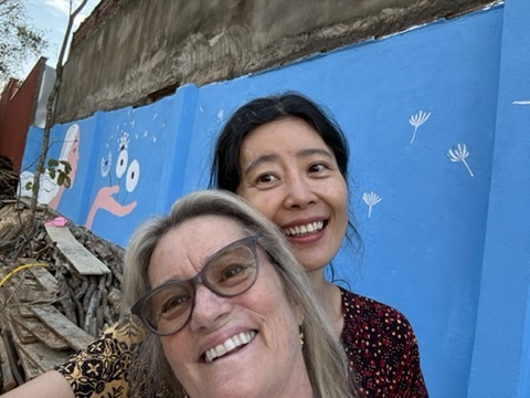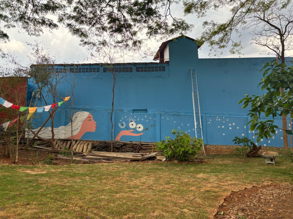 She blows on dandelions, white puffballs of seeds, and wind flying off the seeds, and they transform into stars, and stars come down to the town of Pirenopolis. The mural’s story represents our transformation of the dandelion flowers into seeds as we learn and practice Tara’s Love (wisdom, compassion) through our teacher within the community. Tara’s Love shines our inner Tara’s Love, and we will become stars that shine with our own unique and diverse colorful starry light, even more in darkness. Our Tara’s loving kindness shines on many, and many become Tara’s Light like limitless stars in the sky.