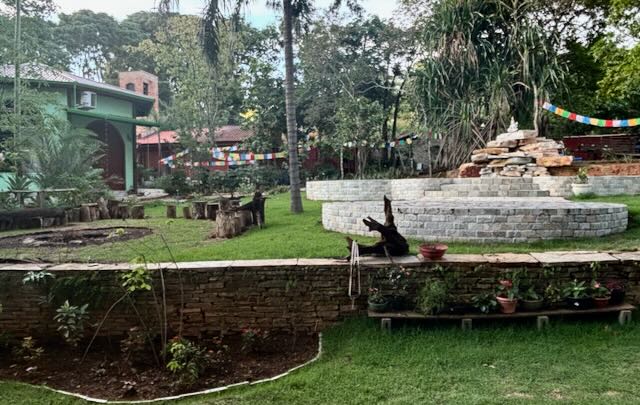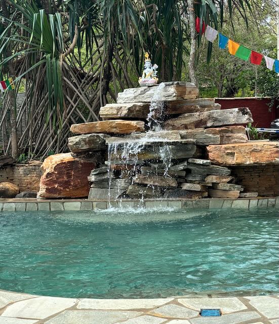 The rains have started and we rejoice as things turn green. Our waterfall sprung a backwards spouting leak, now fixed, it is so inspiring to see White Tara at the top of the fall.