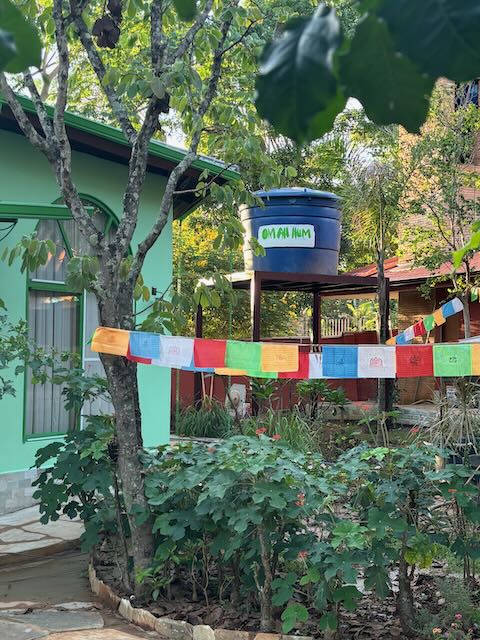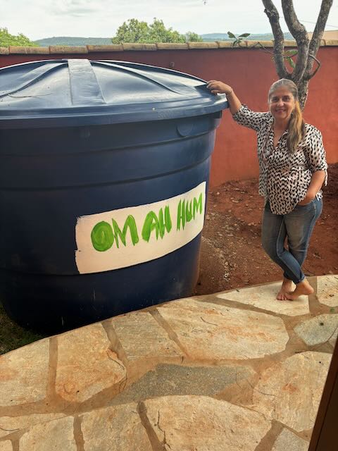 I asked Myri to paint Om Ah Hum on the water tank, so that all the water passing through the land would be blessed. She finished it just in time and before they enclose the tank I managed to snap a picture to share with you.